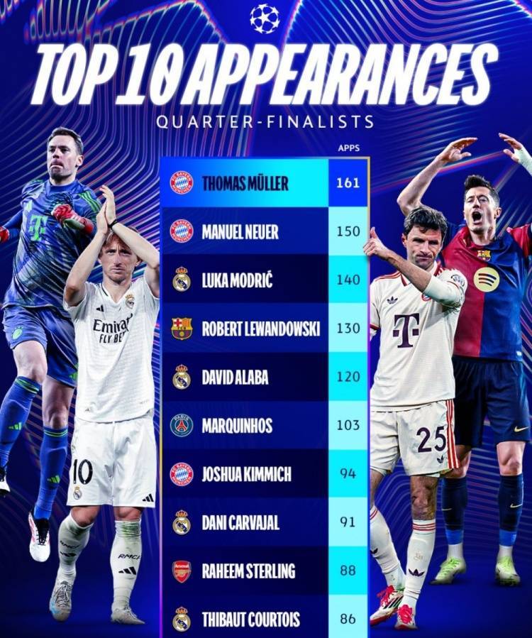 欧冠8强球员赛事出战场次top10:穆勒161场居首,诺伊尔150场次之